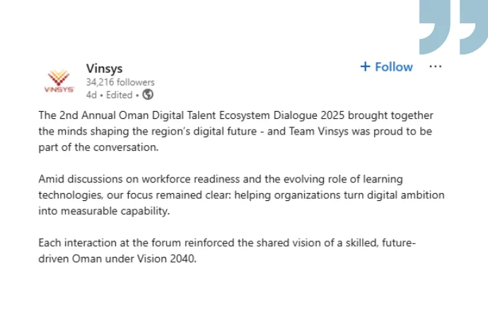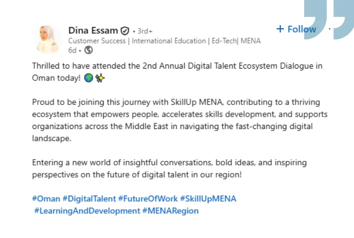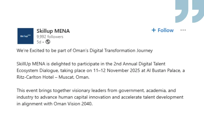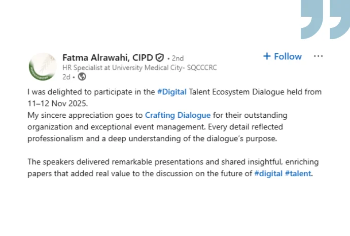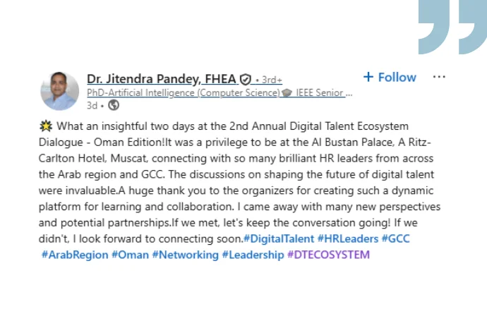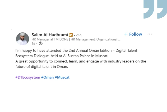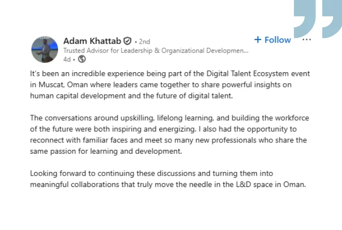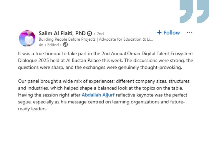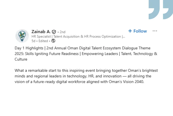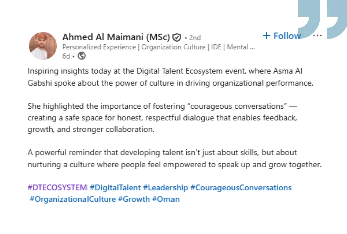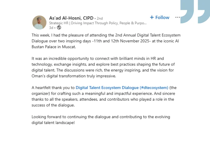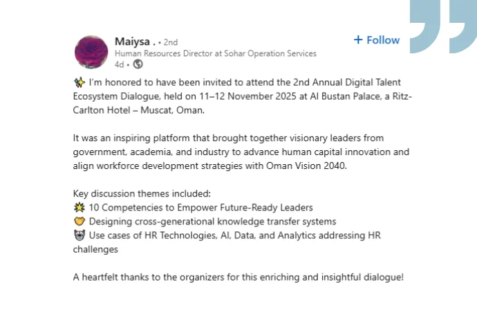 The event inspired collaboration among government, private sector, and academia to build sustainable digital talent ecosystems in Oman. Participants gained practical insights on competency-based HR, ethical AI use, and continuous learning cultures that promote adaptability and inclusion. This reinforced Oman’s commitment to ethical AI leadership and personalized development, equipping the workforce to meet future digital challenges with resilience and skill.