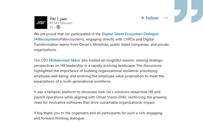 Under Mohammed Akkar’s leadership, Jisr has become one of the most notable success stories in the technology and digital transformation sectors, serving over 4,500+ companies across more than 45+ industries, empowering more than 500K+ employees, and processing payrolls exceeding SAR 10B+. The company has also established strategic partnerships with major government organizations in the Kingdom, and Mohammed Akkar has been featured in several podcasts discussing leadership, entrepreneurship, and digital transformation in business.