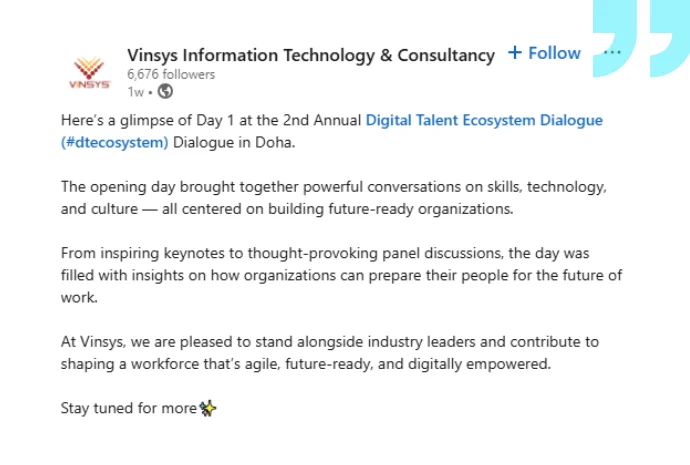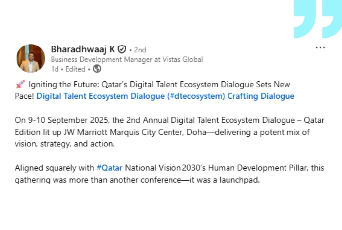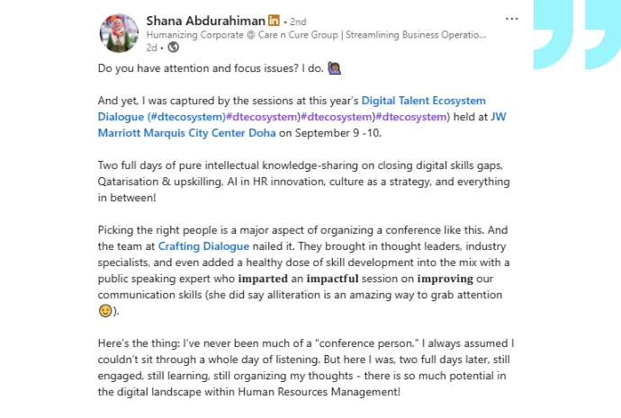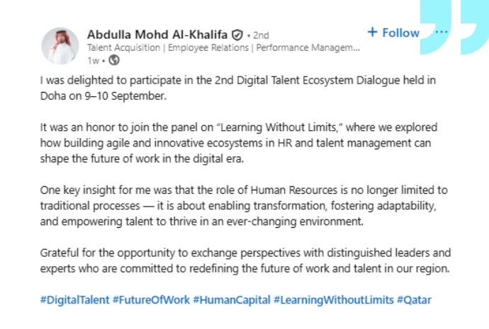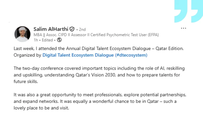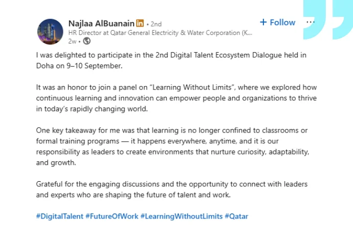 At the second annual Qatar Digital Talent Ecosystem Dialogue, Fatma is eager to contribute her perspective on future readiness and the growing importance of skills-based development in the public sector. She will highlight how continuous learning can serve as a driver of agility and resilience in government institutions, while also addressing the practical steps needed to close skill gaps and build future-ready teams.