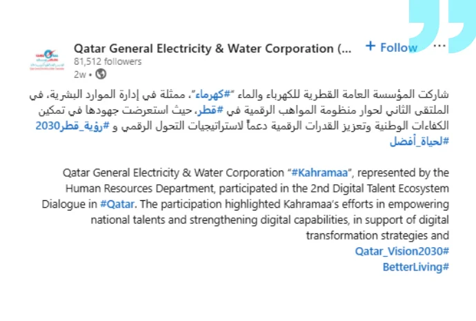 Najlaa Al-Buanain is the Human Resources Director at Kahramaa, with over 17 years of experience in the energy and utilities sector. She is recognized for her strategic vision, people-centered leadership, and ability to align HR practices with both business objectives and national development goals. Throughout her career, Najlaa has led large-scale HR transformations focused on leadership development, workforce planning, and employee engagement. She played an integral role in aligning workforce strategies with Qatar’s national development goals. She is particularly passionate about empowering future leaders and advancing Qatari talent through collaborative programs with government entities and strategic partners. Her recent work includes leading digital HR initiatives and fostering a high-performance, inclusive culture that supports business agility and innovation. As an active contributor to the national HR community, she remains committed to shaping a resilient, future-ready workforce in Qatar. At the 2nd Annual Qatar Digital Talent Ecosystem Dialogue, Najlaa shares her perspective on the evolving role of HR in a digitally driven economy, offering insights rooted in real-world experience and a strong commitment to national talent development.