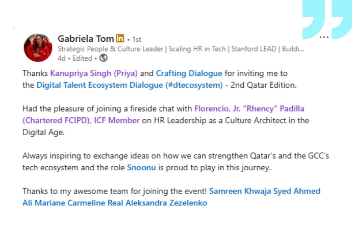 Gabriela Tom is the Director of People & Culture at Snoonu, one of Qatar’s fastest-growing technology companies. With a background in high-growth tech environments and fintech, Gabriela leads Snoonu’s talent strategy, organizational design, and digital people operations, playing a central role in building a future-ready workforce. Originally from Sao Paulo, Brazil, she holds a bachelor’s degree in International Studies and Political Science from the University of Evansville and is currently enrolled in the Stanford LEAD Executive Program, where she is deepening her expertise in leadership and business innovation. Before joining Snoonu, Gabriela was part of Nubank, the largest digital bank in Latin America, where she contributed to scaling people processes during a period of rapid expansion across the region. Her experience bridges both emerging and mature digital markets, bringing valuable insights into building resilient, high-performance cultures in fast-moving environments. Passionate about developing human-centered, tech-enabled organizations, Gabriela brings a global lens to the challenge of shaping Qatar’s digital talent ecosystem.