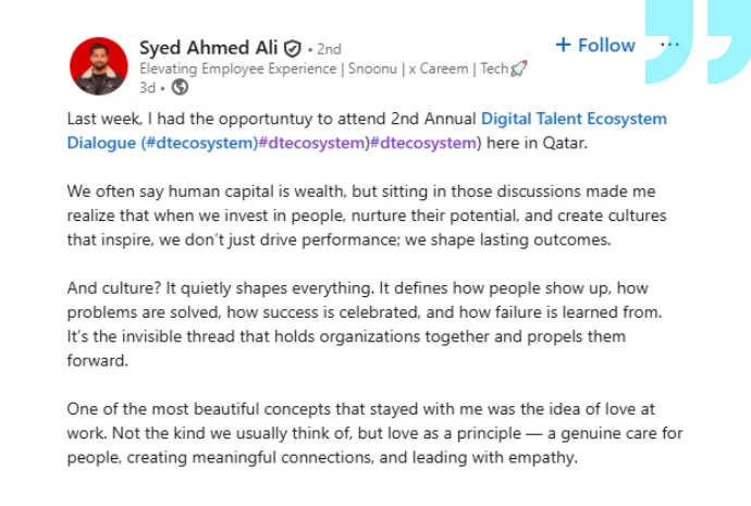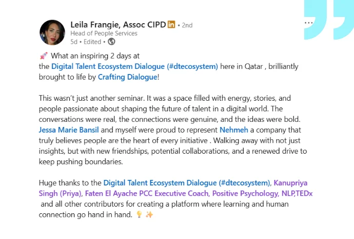 She brings experience from the private sector, having worked at Ooredoo and Qatar National Bank in process enhancement, process re-engineering, and customer experience. This foundation shaped her ability to connect organizational improvement with people development, ensuring learning translates into better outcomes for institutions and citizens.